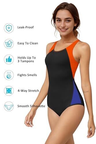 Stay confident in your swim days with a leakproof one-piece that uses a discreet multi-layer design for reliable protection. Quick-dry fabric with UPF 50+ keeps you comfortable, while color-block sides and a racerback ensure a flattering, versatile fit.