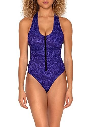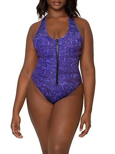 The product is a one-piece swimsuit in Electric Python, size Medium US.
