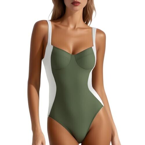 Fiohiros Tummy Control Women's One Piece Swimsuit Detachable Pads Underwire Color Block Crisscross Back Stretchy Swimwear