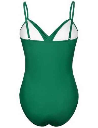 Flattering plus-size one-piece with tummy control that smooths and shapes your silhouette. Features a deep V-neck with ruched details, fixed soft cups for support, adjustable straps, and high-waisted bottoms for moderate coverage in a vibrant green.