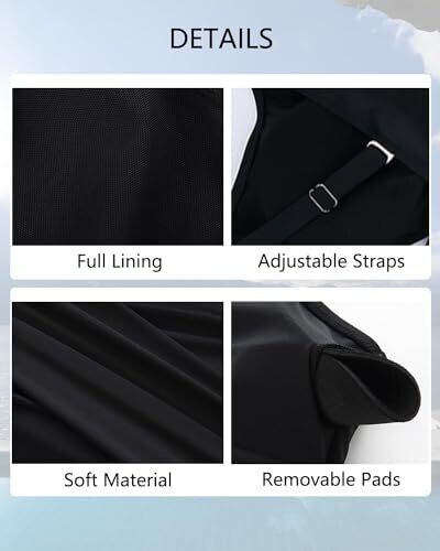 Features include a V-neckline, adjustable shoulder straps, a push-up bra with light padding (removable), and full lining for opacity.