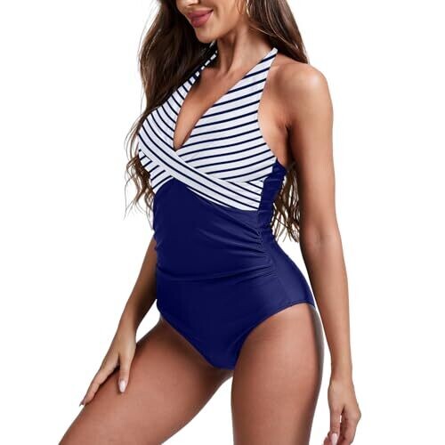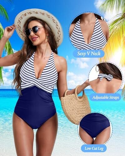 Simlakey Women's One Piece Swimsuit Tummy Control Halter Push Up Swimwear, White Blue Striped, XX-Large